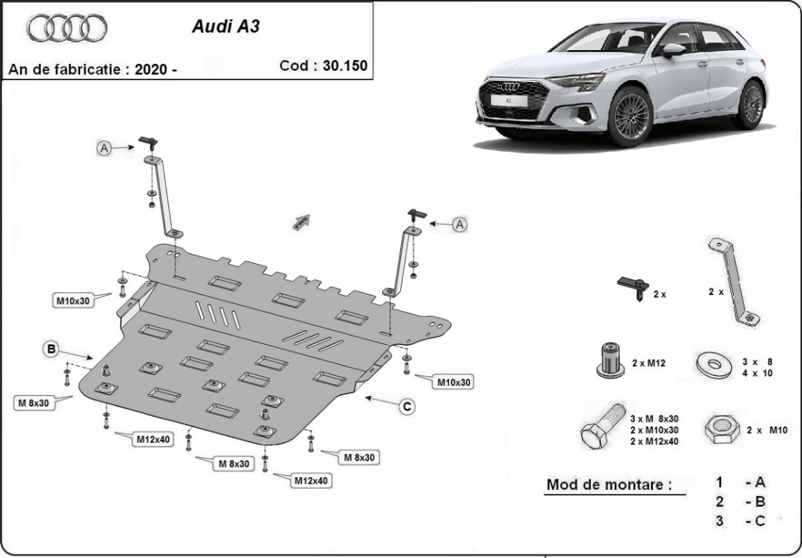 La piastra paramotore di Acciaio è nuova e si adatta perfettamente a tutte le versioni di Audi A3 prodotte tra il 2020 e il 2026. É fatto di lamiera d'Acciaio di 2mm. Bulloni, dadi, rondelle e tutti gli accessori allegati Ogni piastra è resistente alla corrosione ed è ricoperto di vernice in polvere. Le piastre di protezione del motore sono attrezzati di coppie saldate per la miglior resistenza alle forze exteriori. |
