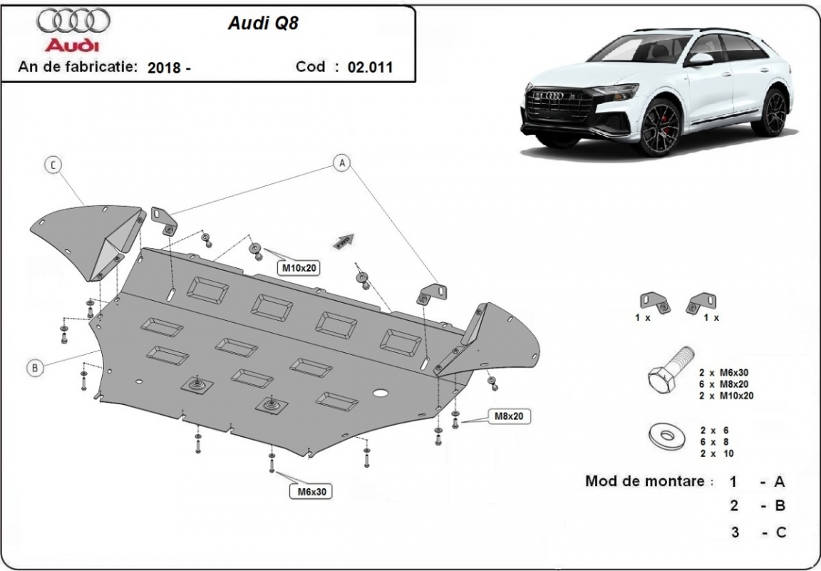 La piastra paramotore di Acciaio è nuova e si adatta perfettamente a tutte le versioni di Audi Q8 prodotte tra il 2018 e il 2020. É fatto di lamiera d'Acciaio di 2mm. Bulloni, dadi, rondelle e tutti gli accessori allegati Ogni piastra è resistente alla corrosione ed è ricoperto di vernice in polvere. Le piastre di protezione del motore sono attrezzati di coppie saldate per la miglior resistenza alle forze exteriori. |