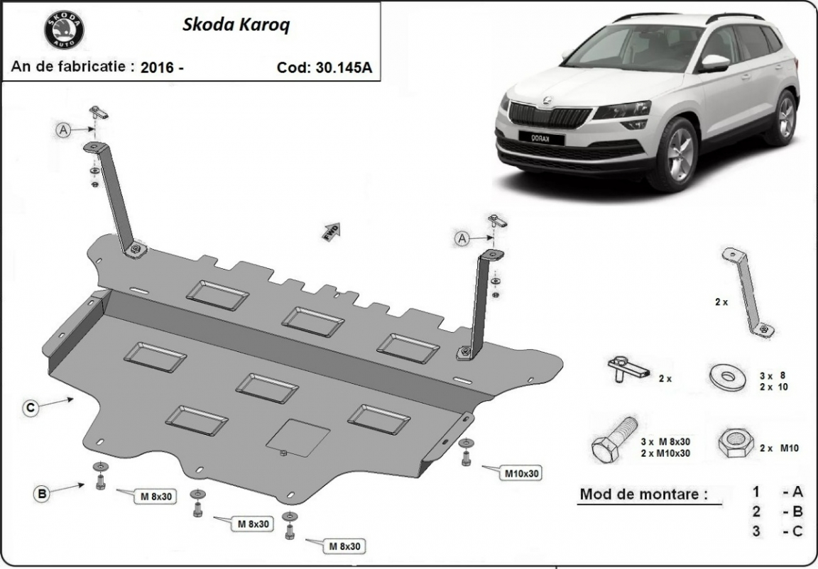 La piastra paramotore di Acciaio è nuova e si adatta perfettamente a tutte le versioni di Skoda Karoq prodotte tra il 2016 e il 2026. É fatto di lamiera d'Acciaio di 2mm. Bulloni, dadi, rondelle e tutti gli accessori allegati Ogni piastra è resistente alla corrosione ed è ricoperto di vernice in polvere. Le piastre di protezione del motore sono attrezzati di coppie saldate per la miglior resistenza alle forze exteriori. |
