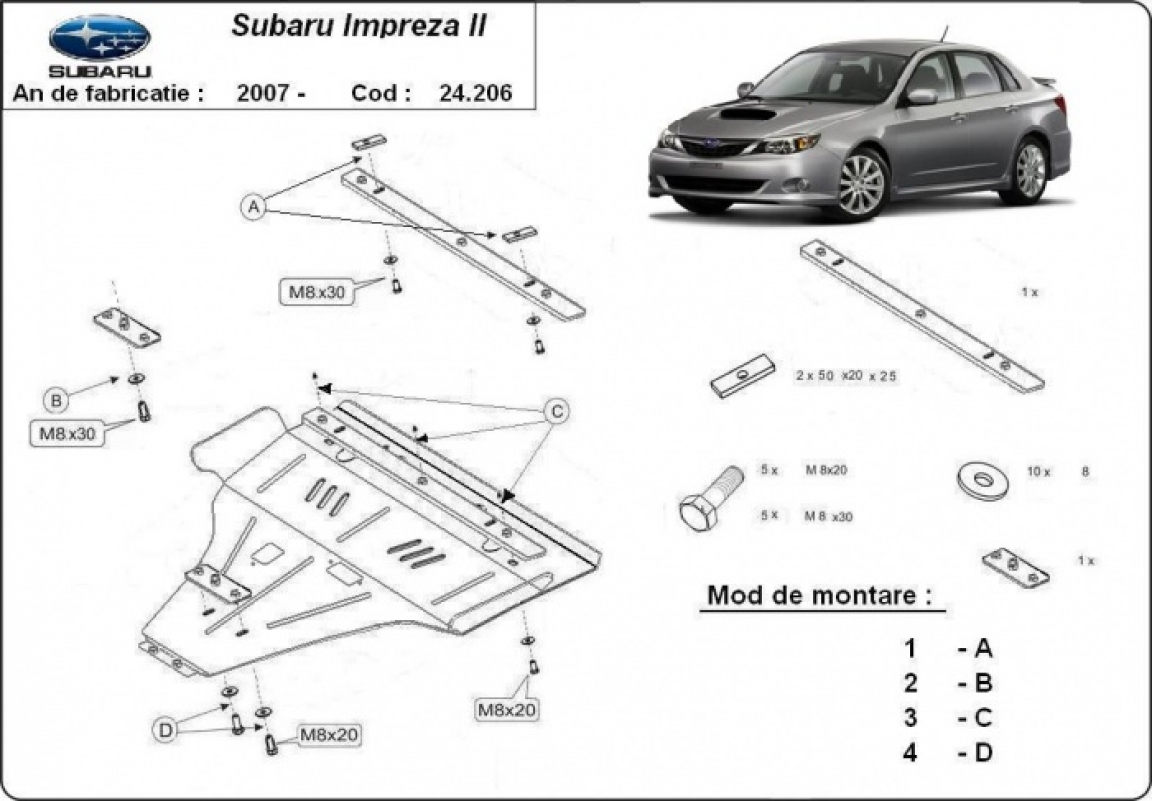 La piastra paramotore di Acciaio è nuova e si adatta perfettamente alla Subaru Impreza, con le seguenti versioni motore / trazione: essence - prodotte tra il 2007 e il 2016. É fatto di lamiera d'Acciaio di 2mm. Bulloni, dadi, rondelle e tutti gli accessori allegati Ogni piastra è resistente alla corrosione ed è ricoperto di vernice in polvere. Le piastre di protezione del motore sono attrezzati di coppie saldate per la miglior resistenza alle forze exteriori. |