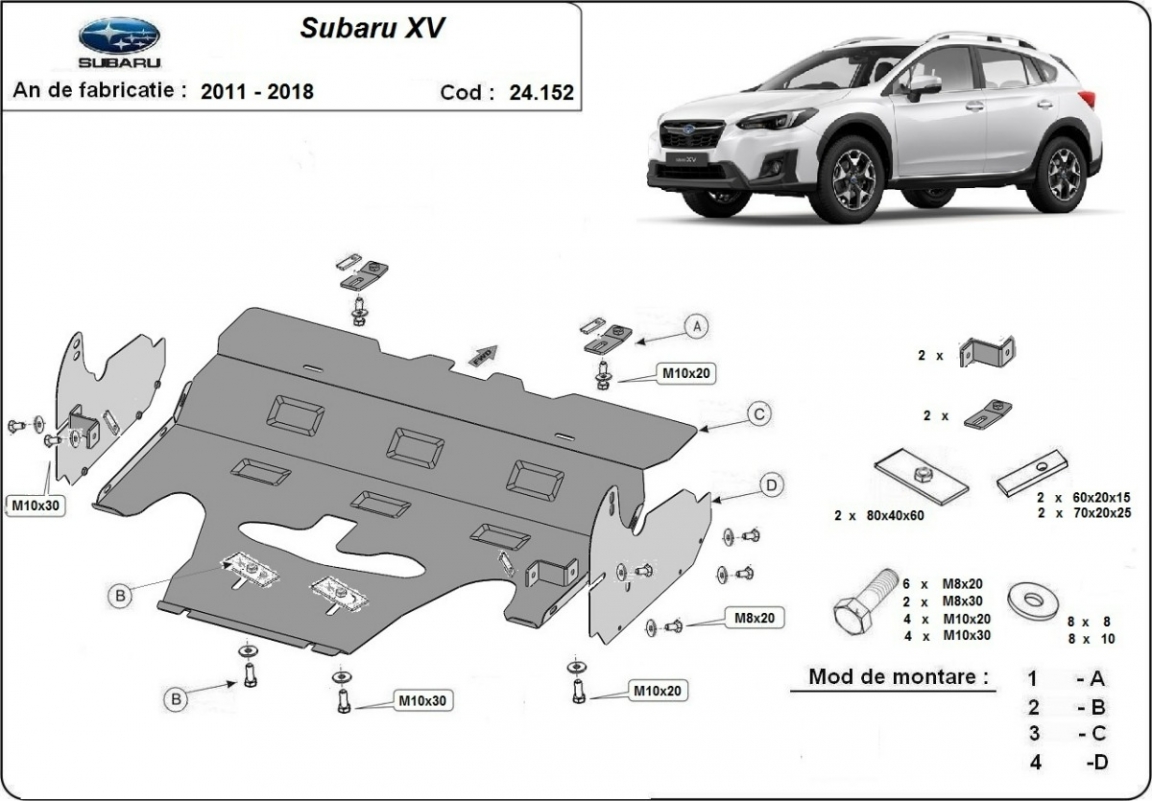 La piastra paramotore di Acciaio è nuova e si adatta perfettamente a tutte le versioni di Subaru XV prodotte tra il 2011 e il 2017. É fatto di lamiera d'Acciaio di 2mm. Bulloni, dadi, rondelle e tutti gli accessori allegati Ogni piastra è resistente alla corrosione ed è ricoperto di vernice in polvere. Le piastre di protezione del motore sono attrezzati di coppie saldate per la miglior resistenza alle forze exteriori. |