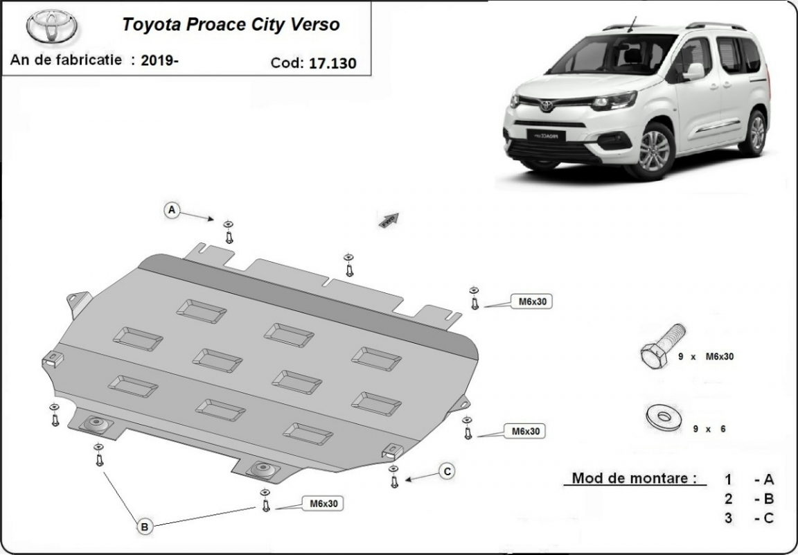 La piastra paramotore di Acciaio è nuova e si adatta perfettamente alla Toyota Proace City, con le seguenti versioni motore / trazione: 1.2 petrol, 1.5 diesel - prodotte tra il 2019 e il 2026. É fatto di lamiera d'Acciaio di 2mm. Bulloni, dadi, rondelle e tutti gli accessori allegati Ogni piastra è resistente alla corrosione ed è ricoperto di vernice in polvere. Le piastre di protezione del motore sono attrezzati di coppie saldate per la miglior resistenza alle forze exteriori. |