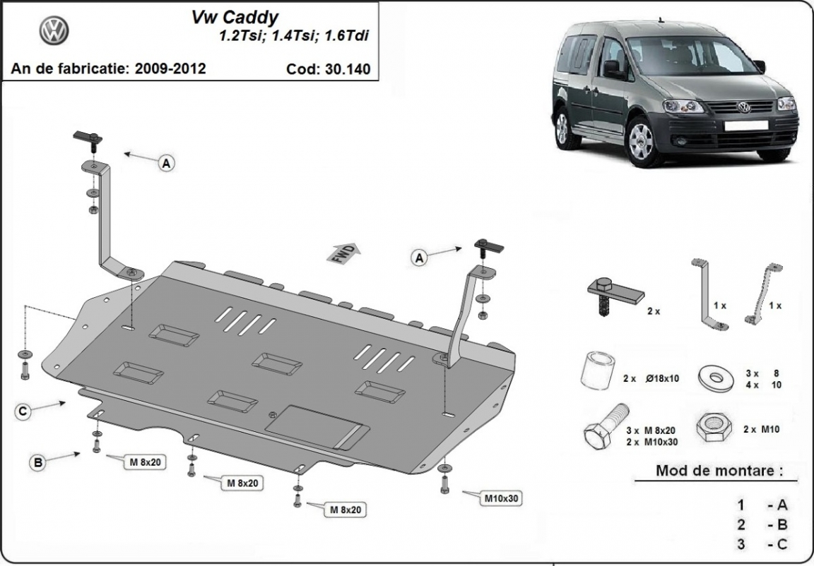 La piastra paramotore di Acciaio è nuova e si adatta perfettamente alla Volkswagen Caddy , con le seguenti versioni motore / trazione: 1.2,1.4,TSI, 1.6TDI, - prodotte tra il 2010 e il 2012. Fornito con l'appertura di scarico olio, quindi, non c'è bisognio di rimuovere la piastra al cambio dell'olio. É fatto di lamiera d'Acciaio di 2mm. Bulloni, dadi, rondelle e tutti gli accessori allegati Ogni piastra è resistente alla corrosione ed è ricoperto di vernice in polvere. Le piastre di protezione del motore sono attrezzati di coppie saldate per la miglior resistenza alle forze exteriori. |