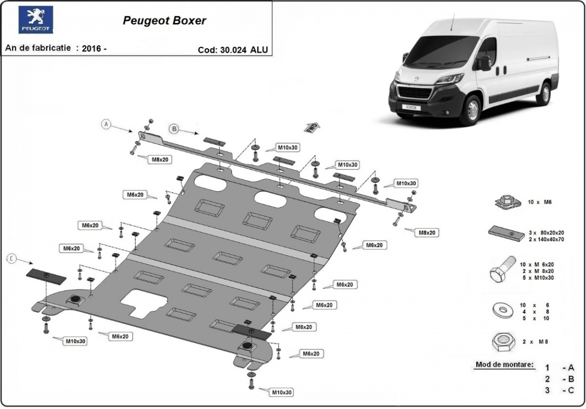 La piastra paramotore di Alluminio è nuova e si adatta perfettamente a tutte le versioni di Peugeot Boxer prodotte tra il 2016 e il 2026. É fatto di lamiera d'Alluminio di 4mm. Gli scudi sono in alluminio, ma i supporti di fissaggio sono in acciaio. Bulloni, dadi, rondelle e tutti gli accessori allegati Ogni piastra è resistente alla corrosione ed è ricoperto di vernice in polvere. Le piastre di protezione del motore sono attrezzati di coppie saldate per la miglior resistenza alle forze exteriori. |