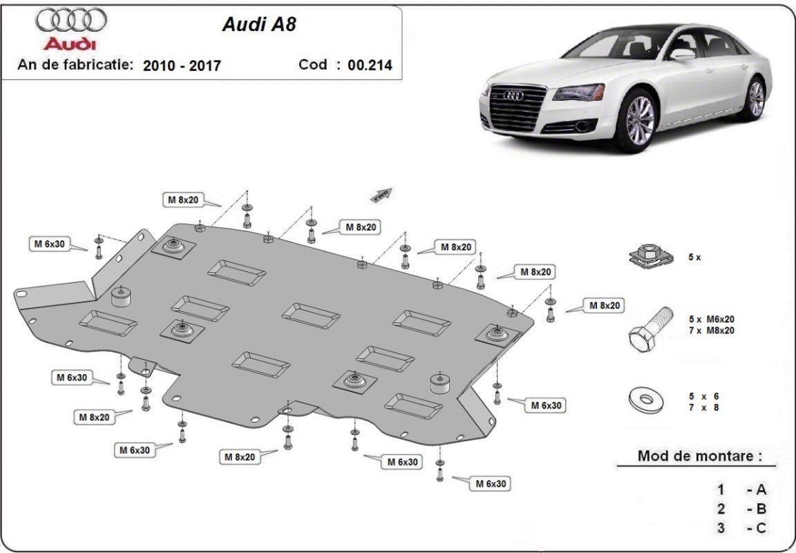 La piastra paramotore di Acciaio è nuova e si adatta perfettamente a tutte le versioni di Audi A8 prodotte tra il 2010 e il 2017. É fatto di lamiera d'Acciaio di 2mm. Bulloni, dadi, rondelle e tutti gli accessori allegati Ogni piastra è resistente alla corrosione ed è ricoperto di vernice in polvere. Le piastre di protezione del motore sono attrezzati di coppie saldate per la miglior resistenza alle forze exteriori. |