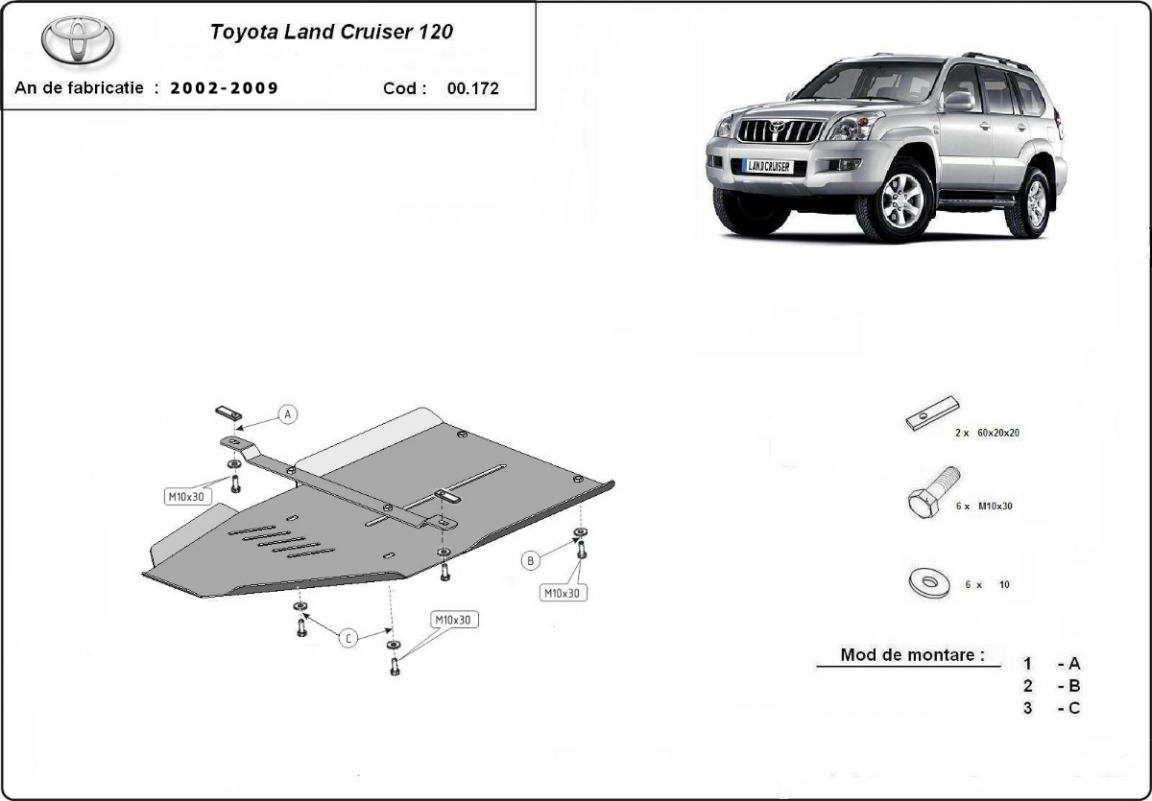 La piastra paramotore di Acciaio è nuova e si adatta perfettamente alla Toyota Land Cruiser J120, con le seguenti versioni motore / trazione: 3.0,4.2 D - prodotte tra il 2002 e il 2009. É fatto di lamiera d'Acciaio di 2.5mm. Bulloni, dadi, rondelle e tutti gli accessori allegati Ogni piastra è resistente alla corrosione ed è ricoperto di vernice in polvere. Le piastre di protezione del motore sono attrezzati di coppie saldate per la miglior resistenza alle forze exteriori. |