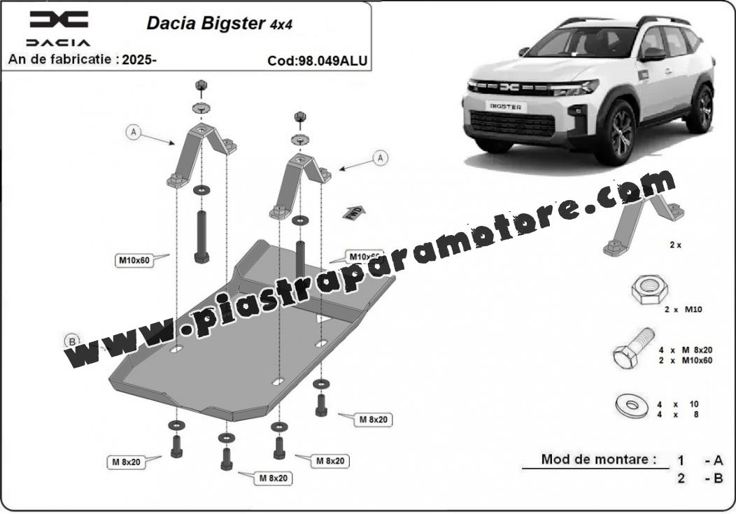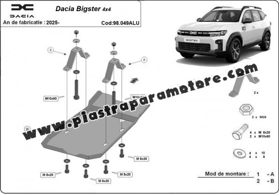 La piastra paramotore di Alluminio è nuova e si adatta perfettamente a tutte le versioni di Dacia Bigster prodotte tra il 2025 e il 2026. É fatto di lamiera d'Alluminio di 4mm. Gli scudi sono in alluminio, ma i supporti di fissaggio sono in acciaio. Bulloni, dadi, rondelle e tutti gli accessori allegati Ogni piastra è resistente alla corrosione ed è ricoperto di vernice in polvere. Le piastre di protezione del motore sono attrezzati di coppie saldate per la miglior resistenza alle forze exteriori. |